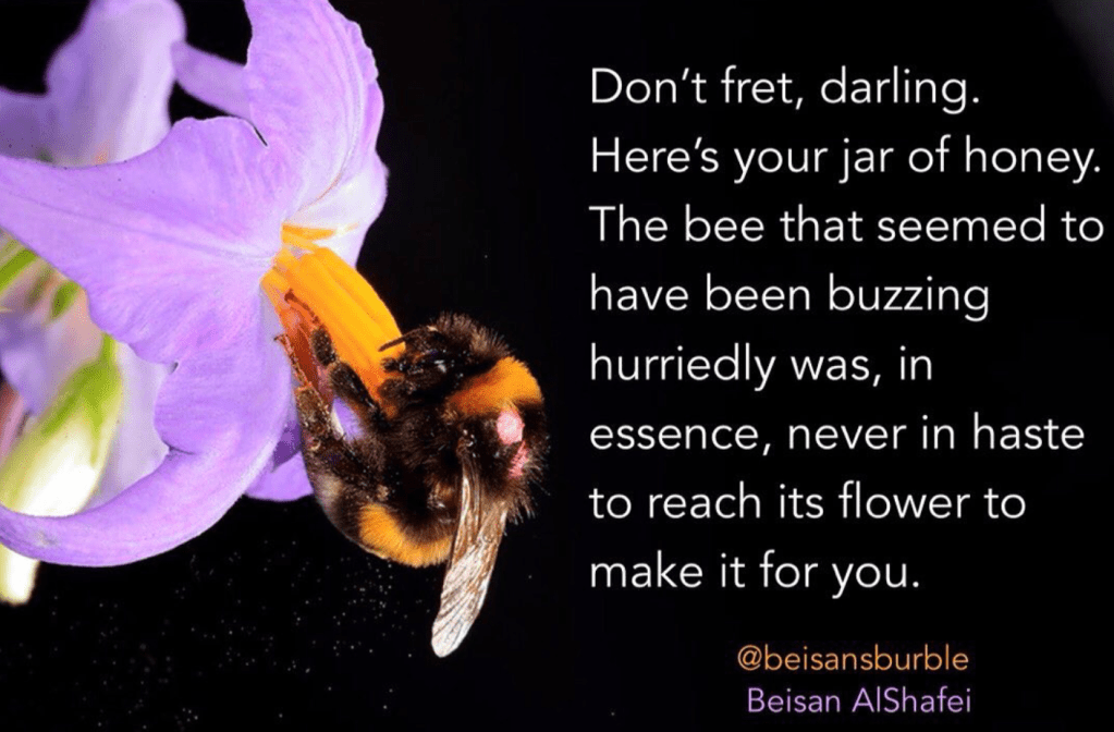 Don’t fret, darling. Here’s your jar of honey. The bee that seemed to have been buzzing hurriedly was, in essence, never in haste to reach its flower to make it for you.
